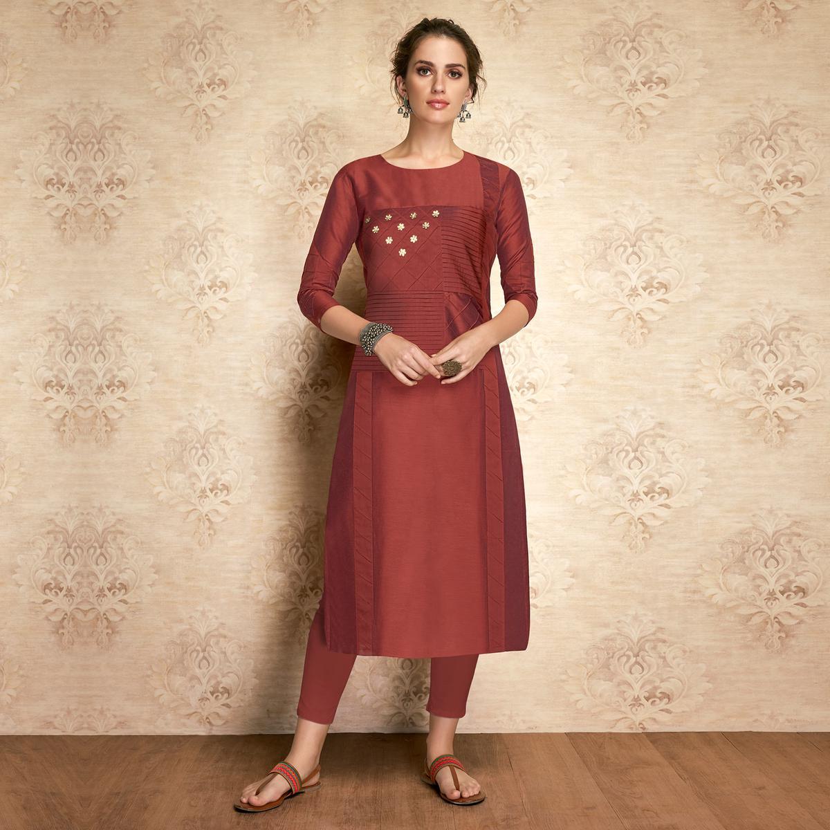 Infuse a unique charm to your personality with this radiant maroon colored kurti. This kurti is fashioned on pure viscose two tone silk fabric and it is attached with malai crepe lining which is lightweight and assures the wearer a perfect fit & comfort. This stitched kurti is beautified with thread embroidered work as shown. Ideal for parties, event, outing & weekend get together. Team it with high heels and fashionable accessories to look more attractive. This attractive kurti set will surely fetch you compliments for your rich sense of style. Note:- The actual product may differ slightly in color and design from the one illustrated in the images when compared with computer or mobile screen.