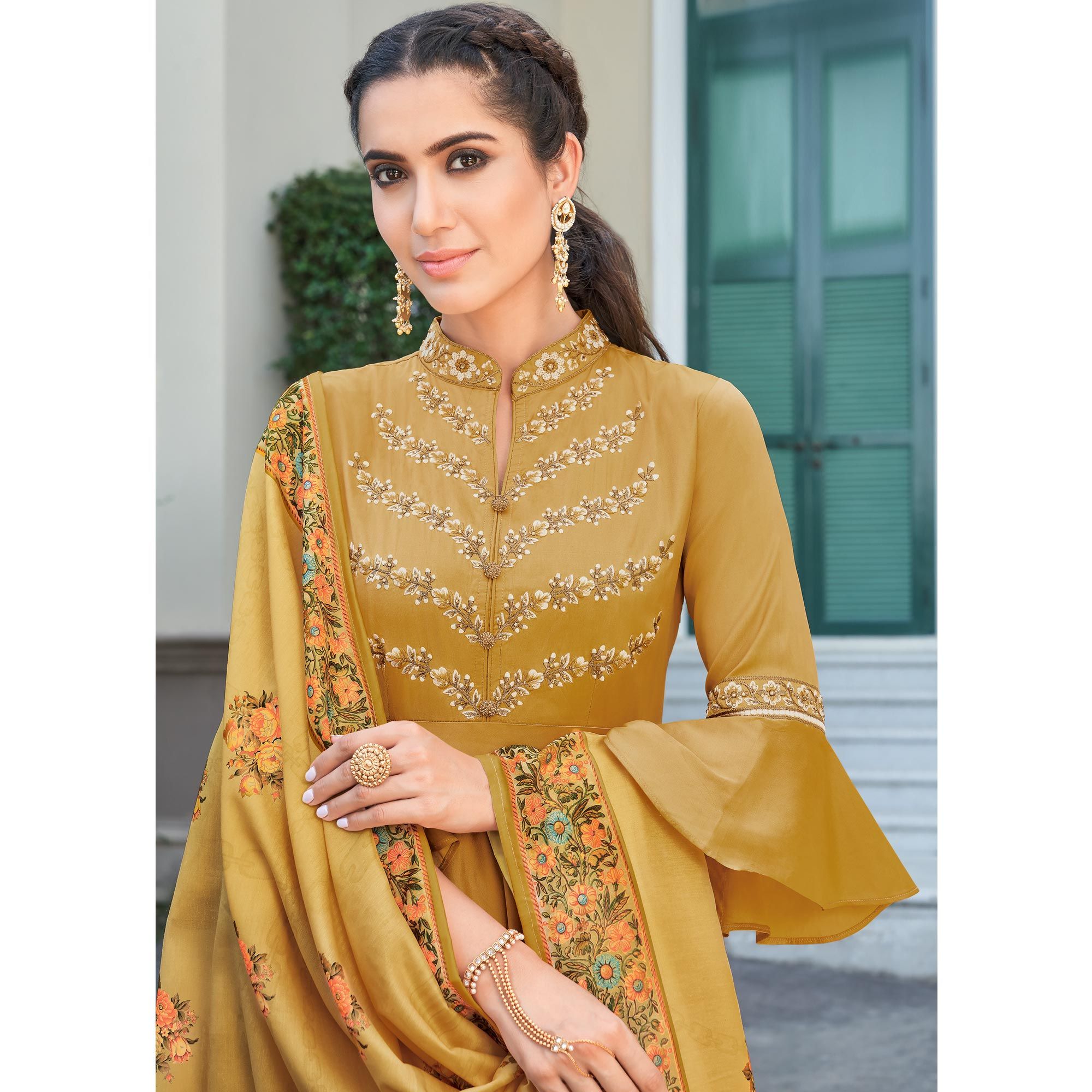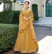 Flamboyant Mustard Yellow Colored Partywear Embroidered Silk Anarkali Suit