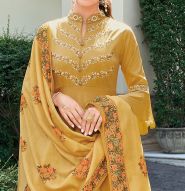 Update your out of date wardrobe with this flamboyant mustard yellow colored soft silk floor length anarkali suit. The brilliant stitched suit creates a dramatic canvas with remarkable embroidery as shown. This stitched outfit is attached with semi-stitched santoon bottom and attached inner along with chiffon dupatta. Specially designed to wear for wedding functions, receptions, engagement ceremony and family occasions, where you want to be the center of attraction. Team this suit with classy accessories and high heel for a complete look. Get this suit now before it's gone out of stock. This party wear anarkali suit won't fail to impress everyone around you. Note:- The actual product may differ slightly in color and design from the one illustrated in the images when compared with computer or mobile screen
