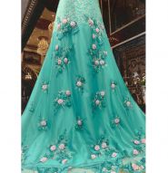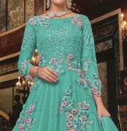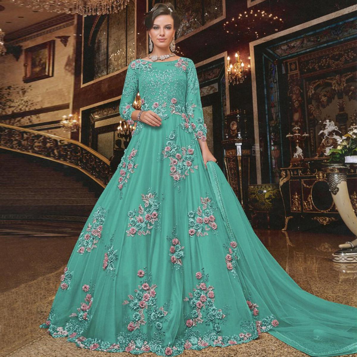 Appealing Aqua Blue Colored Partywear Embroidered Soft Net Anarkali Suit
