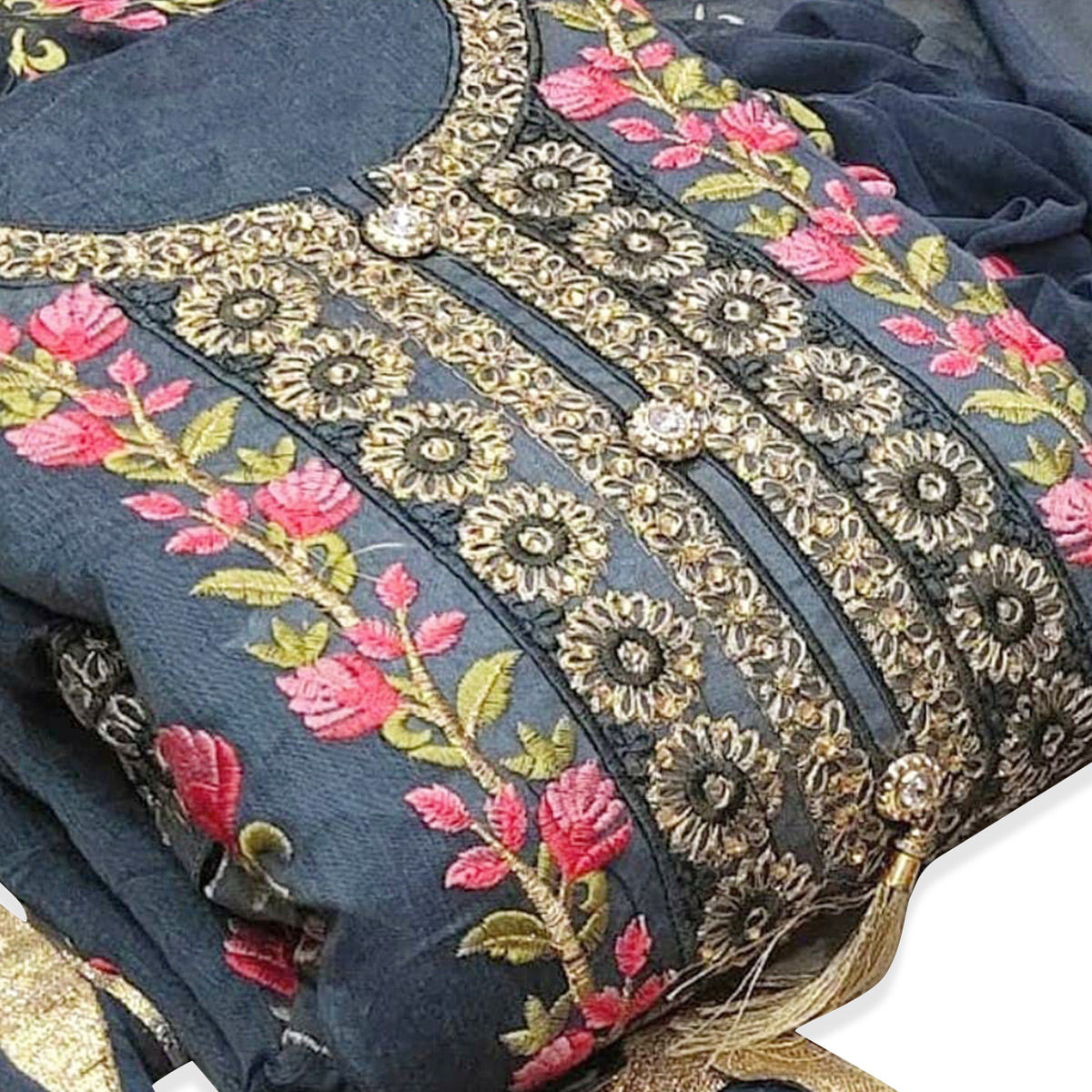Trendy Grey Colored Party Wear Floral Embroidered Modal Dress Material