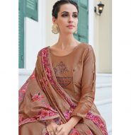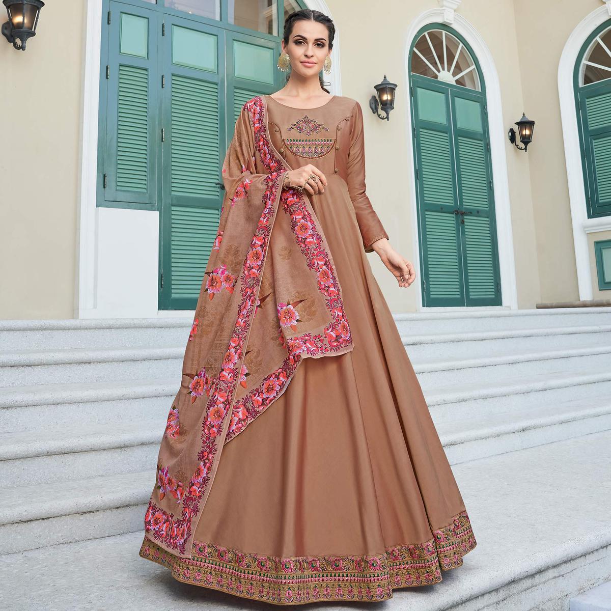 Get in touch with your feminine side as you wear this flattering brown colored soft silk floor length anarkali suit. The brilliant stitched suit creates a dramatic canvas with remarkable embroidery as shown. This stitched outfit is attached with semi-stitched santoon bottom and attached inner along with chiffon dupatta. Specially designed to wear for wedding functions, receptions, engagement ceremony and family occasions, where you want to be the center of attraction. Team this suit with classy accessories and high heel for a complete look. Get this suit now before it's gone out of stock. This party wear anarkali suit won't fail to impress everyone around you. Note:- The actual product may differ slightly in color and design from the one illustrated in the images when compared with computer or mobile screen.