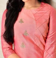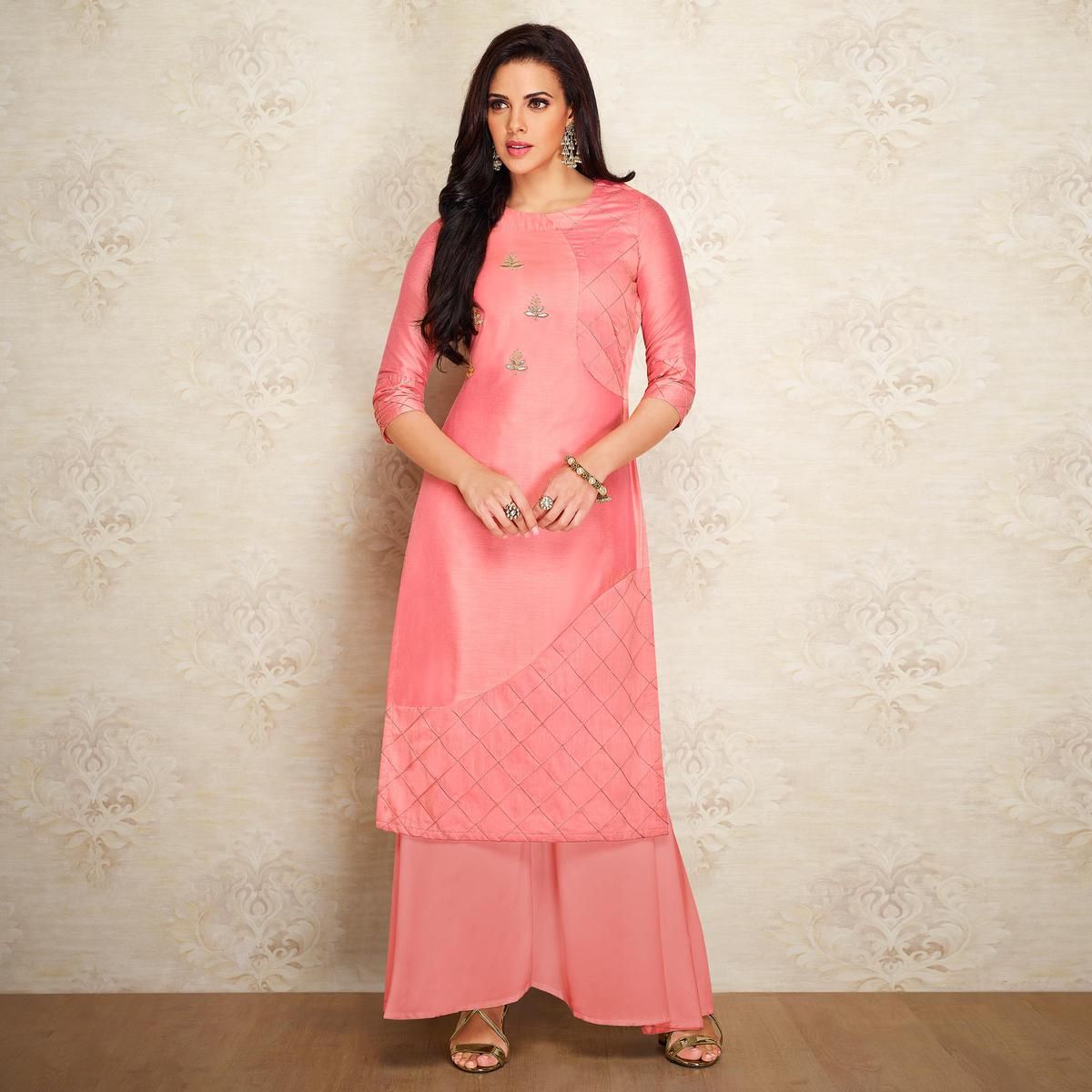 Add grace and charm towards the appearance in this sophisticated pink colored palazzo suit. The suit is made of pure viscose silk fabric that has elegan gota patti embroidery work done which is eye catching. Comes along with pure viscose silk bottom and cotton lining. Specially designed to wear for functions, receptions and family occasions, where you want to be center of attraction. Pair it up with classy accessories and heels to make your look more attractive. Get this suit now before it's gone out of stock. Note:- The actual product may differ slightly in color and design from the one illustrated in the images when compared with computer or mobile screen