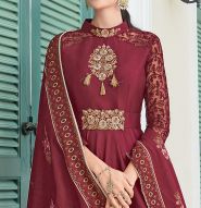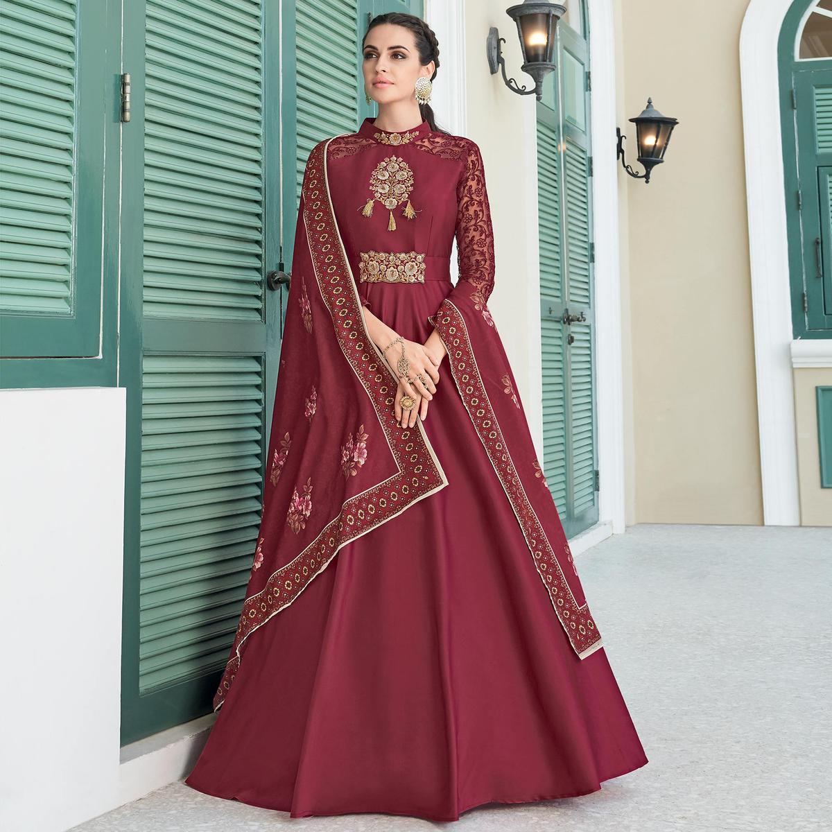 Unique Maroon Colored Partywear Embroidered Silk Anarkali Suit