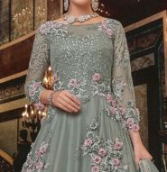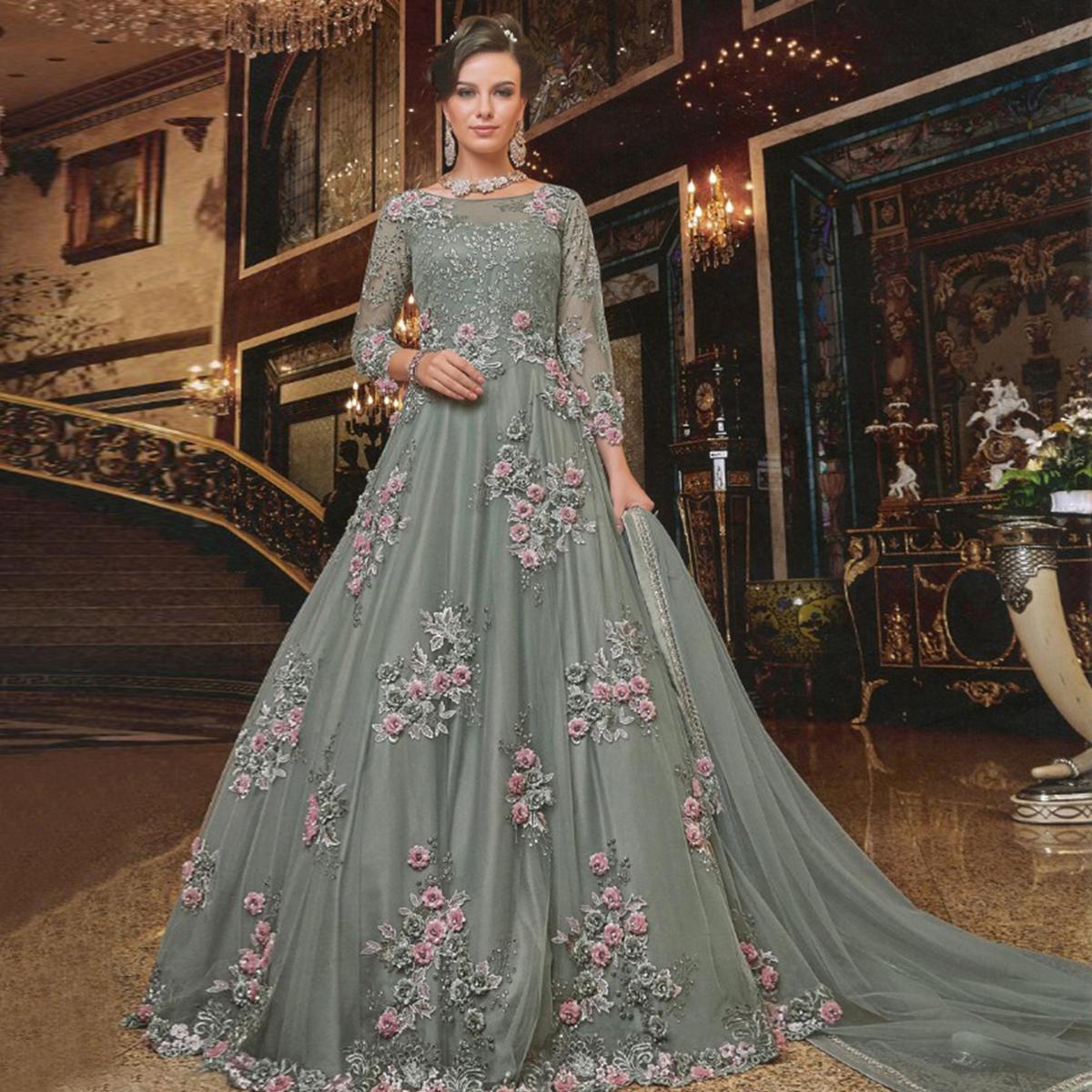 You will be bound to make a powerful style statement with this blooming grey colored soft net anarkali suit. The brilliant suit creates a dramatic canvas with remarkable embroidered work as shown. This outfit is attached with santoon bottom and japan satin lining along with netted dupatta. Specially designed to wear for wedding functions, receptions, engagement ceremony and family occasions, where you want to be the center of attraction. Team this suit with classy accessories and high heel for a complete look. Get this suit now before it's gone out of stock. This party wear anarkali suit won't fail to impress everyone around you. Note:- The actual product may differ slightly in color and design from the one illustrated in the images when compared with computer or mobile screen.