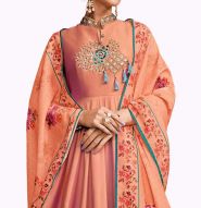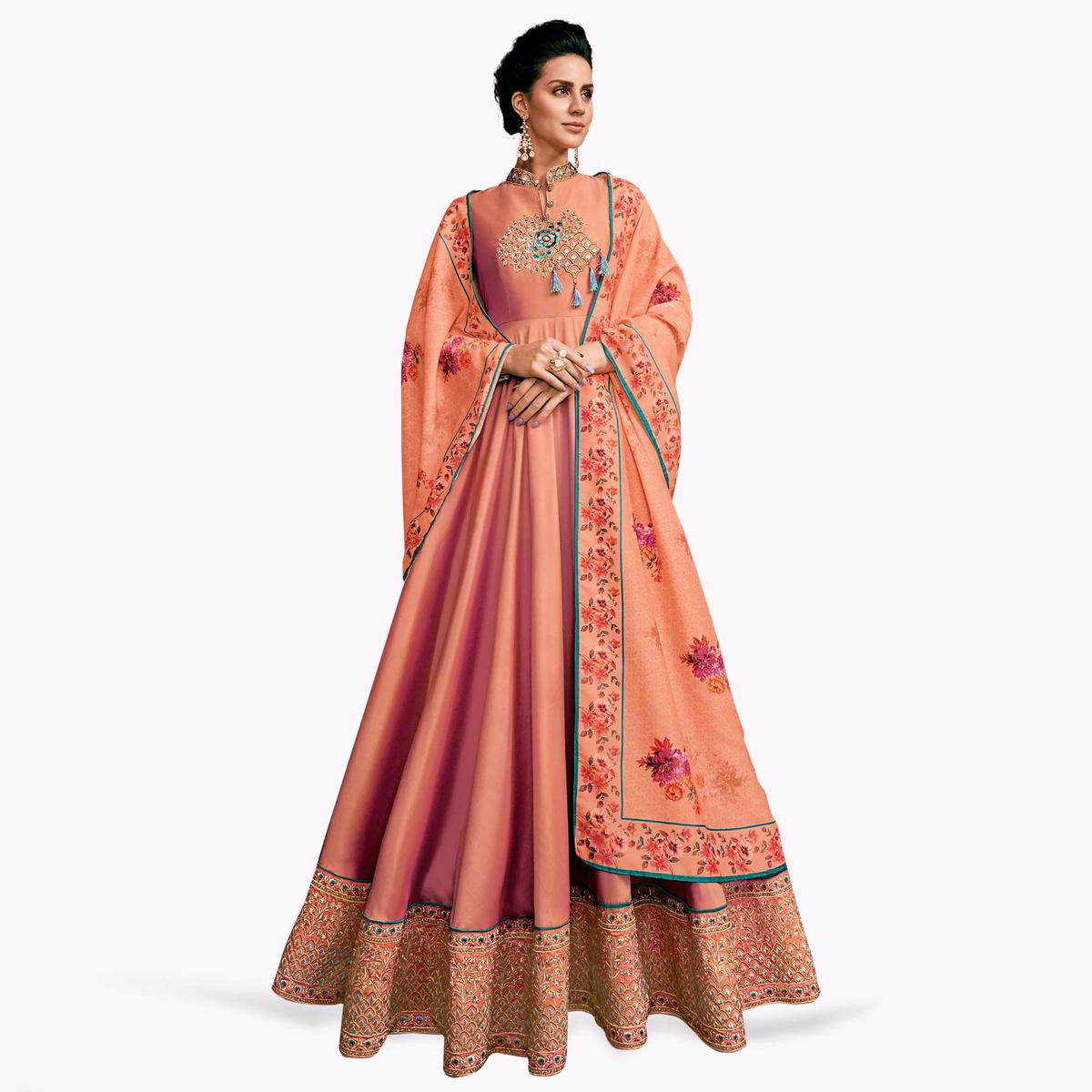 Glowing Peach Colored Partywear Embroidered Silk Abaya Style Anarkali Suit