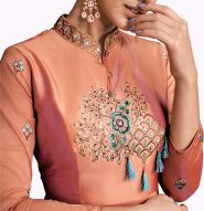 Go for the sophisticated look with this glowing peach colored abaya style anarkali suit. This beautiful suit is prettified with lovely embroidery work which makes it appear classy. The top is made of heavy soft silk accompanied with unstitched santoon bottom, along with printed muslin dupatta. Women can buy this designer suit to wear for their upcoming functions, festivals, wedding functions or engagement ceremonies and occasions, where you want to be center of attraction. This attractive suit will surely fetch you compliments for your rich sense of style. Team it with stylish accessories to make your looks more beautiful. Note:- The actual product may differ slightly in color and design from the one illustrated in the images.view less
